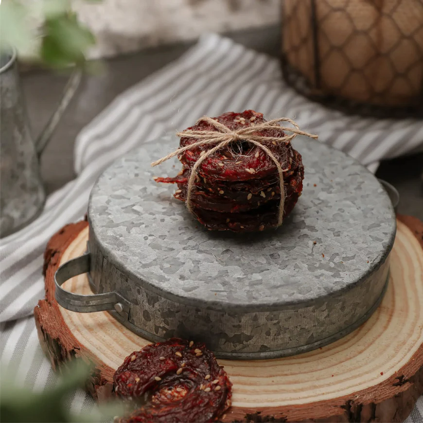 雞肉貝果採用台灣在地新鮮雞肉厚切製作,而後撒上有機白芝麻來豐富其營養以及風味。因為厚切原肉所需的風乾時間較一般薄片長,且芝麻含有豐富的健康油質,因此會加深雞肉貝果的色澤,這是自然現象,可以放心食用哦!