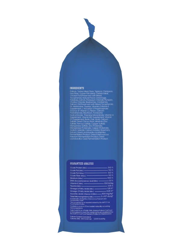 鱈魚,火雞茸,豌豆,木薯,鷹嘴豆,豌豆纖維,深海魚茸,雞肉茸,雞肉脂肪(以混合生育酚保存),天然香料,乾雞蛋,馬鈴薯,胡蘿蔔,氯化鉀,南瓜,氯化膽鹼,藍莓,蔓越莓,三文魚油(以混合生育酚保存),DL-蛋氨酸,牛磺酸,維生素(維生素E補充劑,L-抗壞血酸-2-多磷酸酯(維生素C的來源),菸酸,泛酸鈣,核黃素補充劑,鹽酸吡哆醇(維生素B6),硝酸硫胺(維生素B1) ,維生素A補充劑,維生素B12補充劑,維生素D3補充劑,生物素,葉酸),硫酸鈣,乾菊苣根,礦物質(硫酸鋅,硫酸亞鐵,硫酸銅,硫酸錳,蛋白質鋅,蛋白質錳,蛋白質銅,亞硒酸鈉,碘酸鈣),迷迭香提取物,嗜酸乳桿菌發酵產物,腸球菌糞便發酵產物,乾酪乳桿菌發酵產物。
